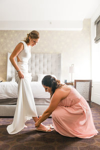 We suggest getting hair and makeup done at The Courtyard by Marriott, but getting into your dresses at The Barn on Bride's carriage house. The Barn allows you to arrive 2 hours prior with the option to add on hours. We've found it's helpful to add an extra hour, especially if you're sharing in a first look. This gives you enough time to arrive, get in your dress, and take pictures without any stress.